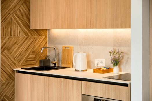 Przestronny apartament z częścią dzienną z dużą narożną sofą (140×200). Stylową łazienką z prysznicem z deszczownicą, oraz łóżkiem 160×200, a także doskonale wyposażony aneks kuchenny. Znajduje się na niskim parterze. Prywatne wejście.