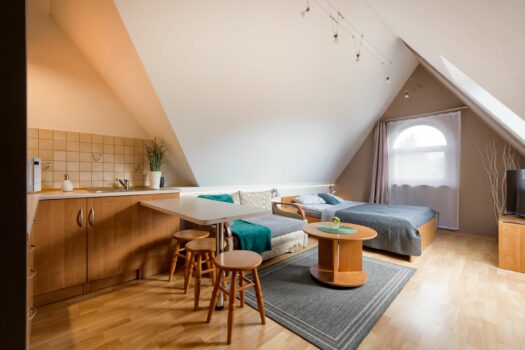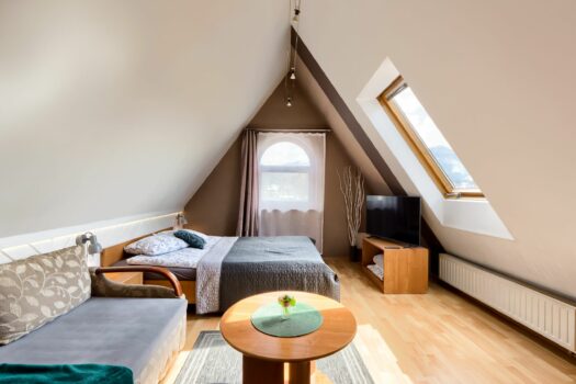 Przytulny, starannie zaprojektowany i wyposażony pokój. Do dyspozycji gości łóżko małżeńskie 140×200 i dodatkowe miejsce do spania na rozkładanej sofie 130×200. Pokój znajduje się na 3 piętrze budynku z okna pokoju widok na góry.